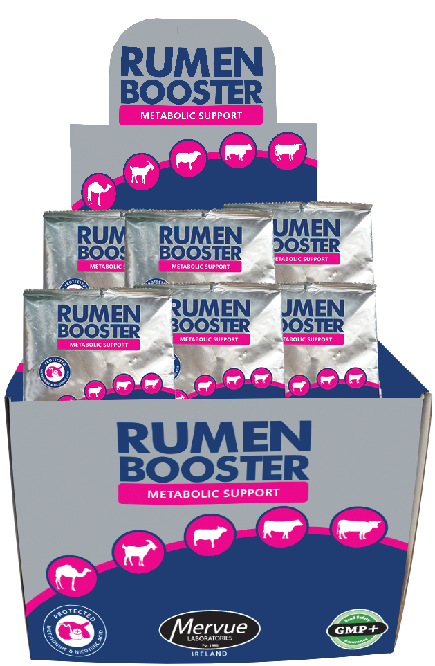 Rumen Booster supports:  Animals off feed  Recovering from illness or veterinary treatment  As part of treatment protocols for treatment of metabolic disease example ketosis  Anorexic animals. Example cows suffering from metritis/septic mastitis  Animals suffering heat stress  Cows after calving RUMEN BOOSTER is formulated to: ✓ Stimulate microbial activity in the rumen ✓ Stimulate metabolism ✓ Stimulate appetite ✓ Stimulate liver ✓ Stabilise rumen pH ✓ Boost recovery Feeding instructions Cows – Feed the contents of one sachet (100g) mixed in feed twice daily for 4 days for optimum results. Cows after calving – 1 sachet immediately after calving. If appetite is reduced give the contents of 2 sachets (200g) twice daily for 2 days. Young Cattle – Feed as above giving half quantities in each case Calves – Feed 15g in milk daily for a week